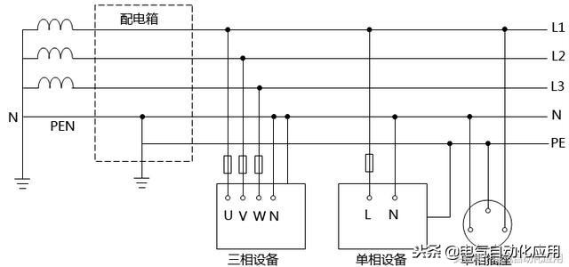 零线(N): 从变压器中性点接地后引出主干线。